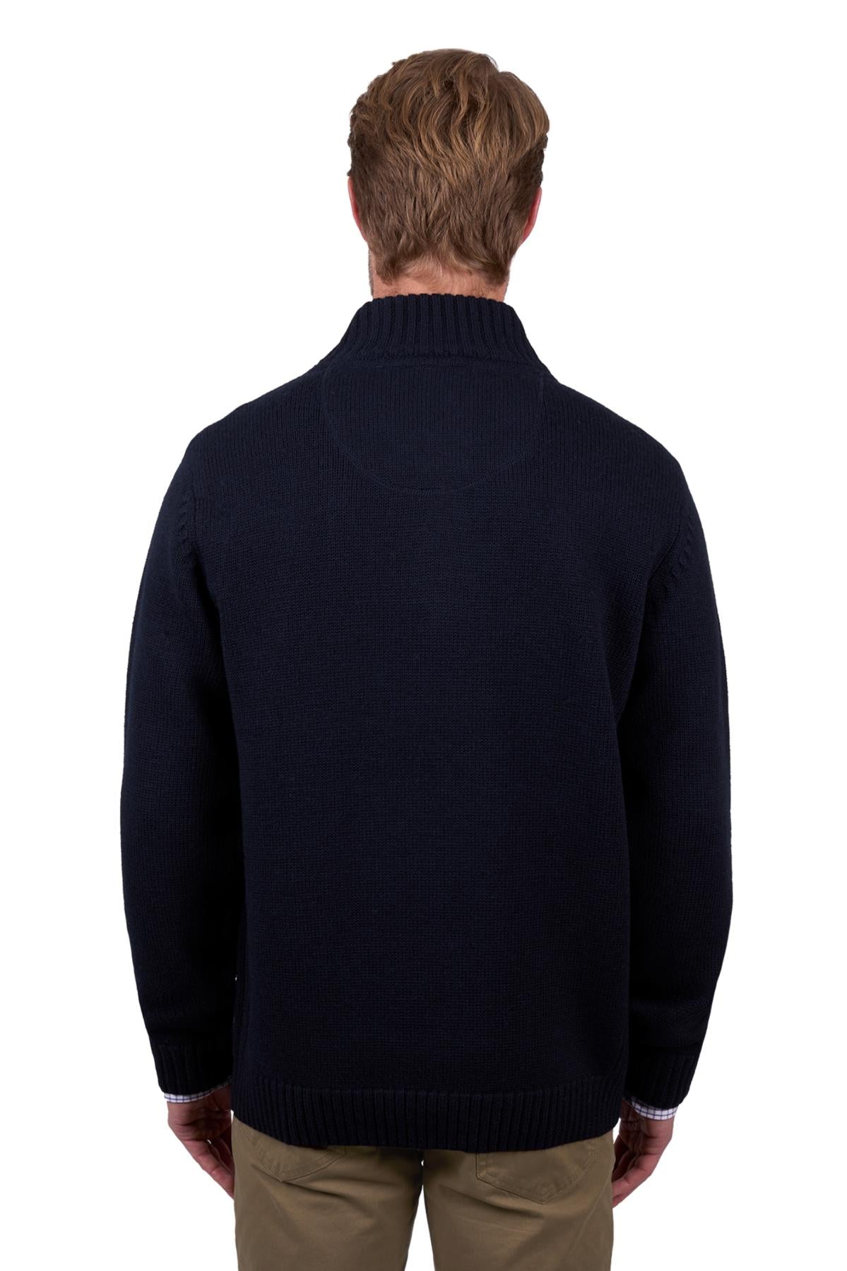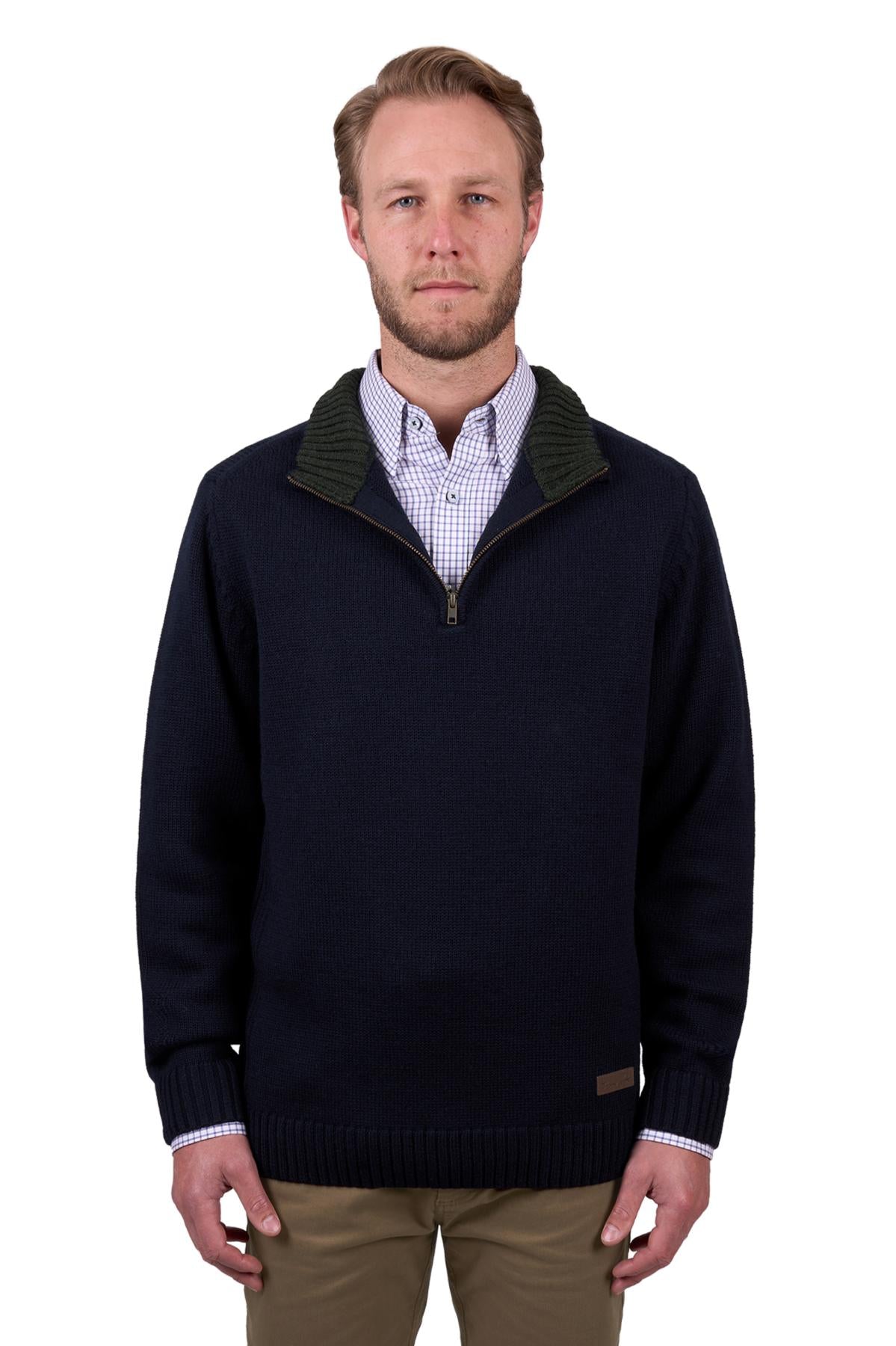 Heavyweight chunky rib knit, 100% Australian merino wool, contrast inner collar, rib side panels, collar, sleeve, cuff and hem to keep shape, 1/4 placket with premium quality metal zip closure