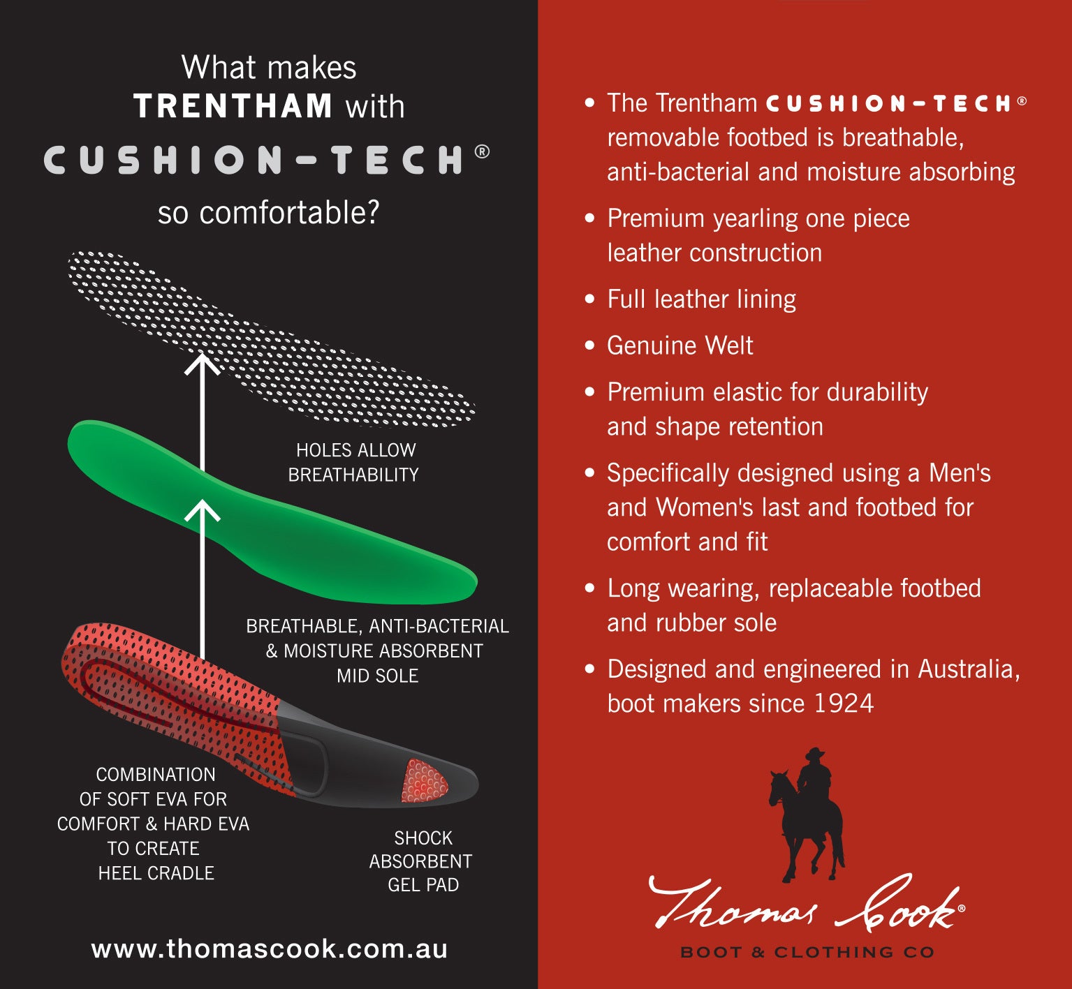 The Trentham is a classically styled comfortable leather dress boot, lasted in a wide C fit. Designed in Australia using just one piece of the finest Argentinian Yearling leather, the Trentham features a classic square toe and block heel with a genuine welted sole. The Cushion-Tech® innersole has a combination of soft and hard EVA to create a heel cradle and a shock absorbent gel toe pad for ultimate comfort. The middle layer of the innersole is breathable, anti-bacterial and moisture absorbent which allows the foot to breathe. The rubber outsole is extremely durable, flexible and also replaceable.